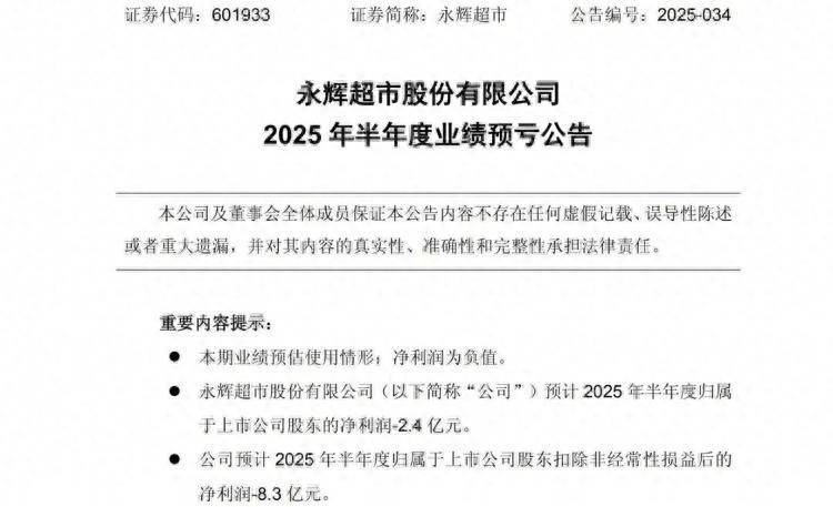 8月20日晚间,永辉超市股份有限公司(以下简称“永辉超市”)发布2025年上半年业绩情况,今年上半年实现营业总收入299.48亿元,同比下跌20.73%;归属于上市公司股东的净利润为-2.41亿元,去年同期净利润为2.75亿元,净利润减少了5.16亿元。